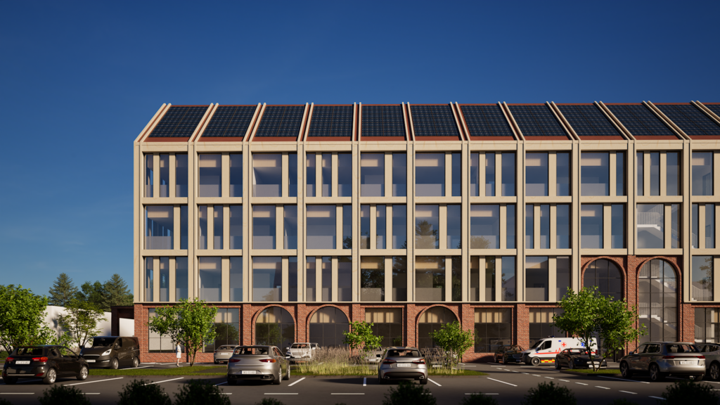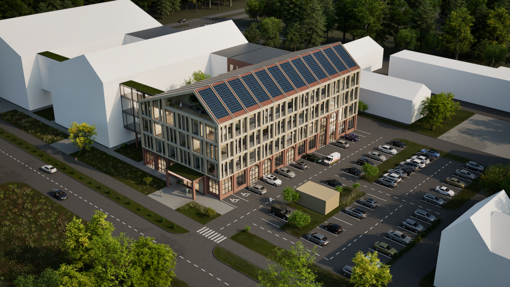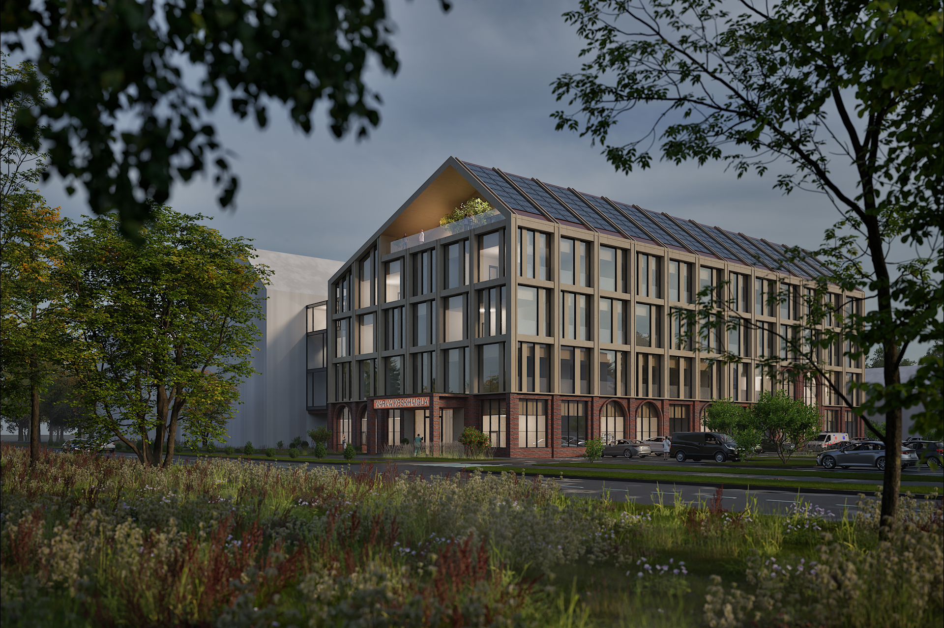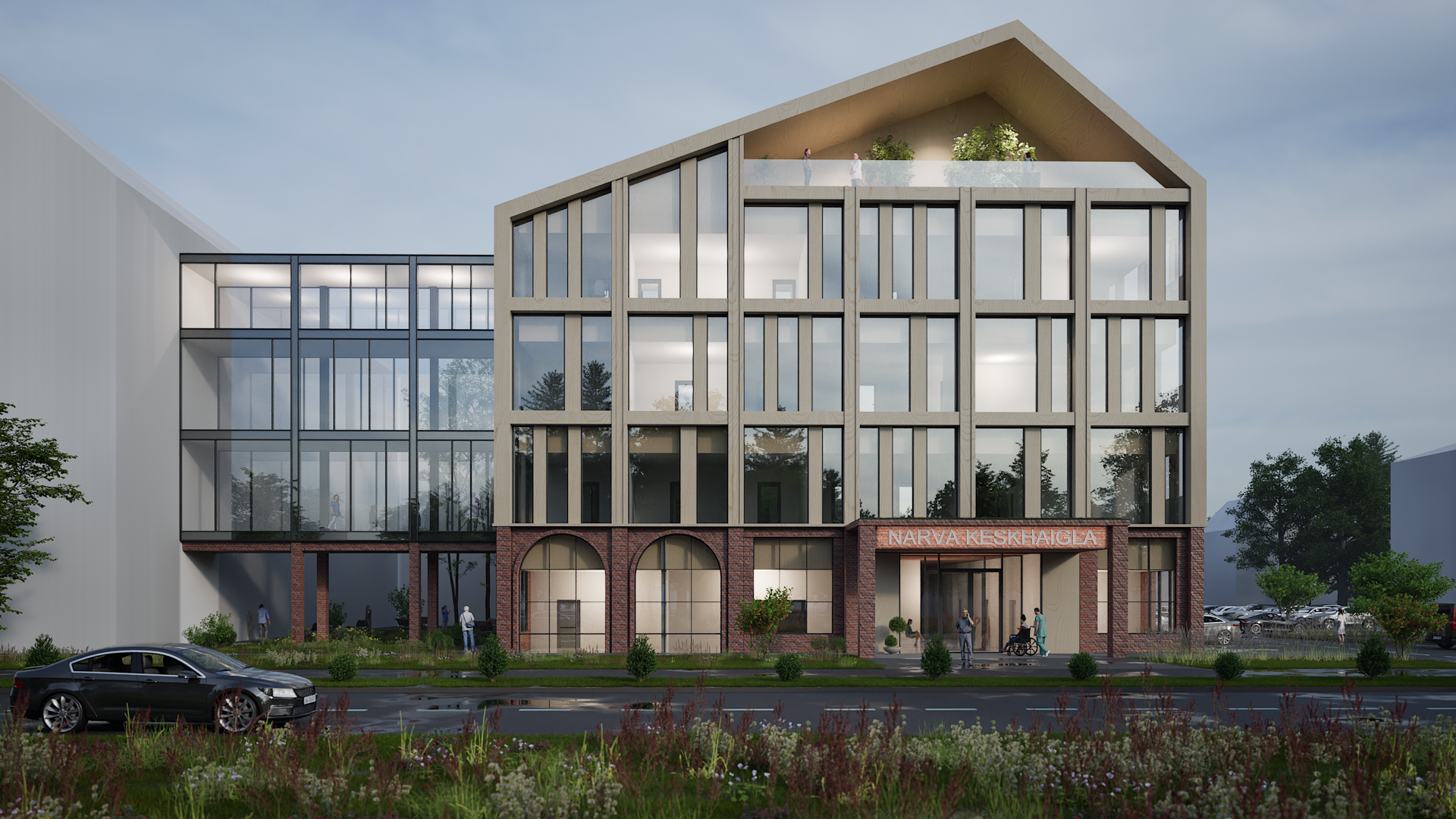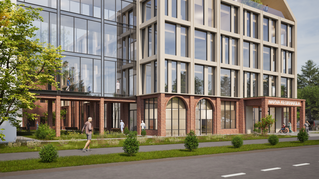 Kavandatud hoone fassaad väärtustades olemasolevat kordab punast fassaaditellist ja kaarjaid vorme esimese korruse mahus. Ülemised tüüpkorruse fassaad toob sisse soliidse ja tagasihoidliku puidu, säilitades lihtsa sümmeetrilise fassaadikeele. Mängides kaasaegsel viisil piirkonnas eksisteeriva kahe ajajärgu arhitektuuriga. Välisseinte tumepunase tellis harmoneerub olemasolevate hoonetega ja hoiab ühtset stiili, lisaväärtust annab naturaalne puidutoon, mis sobitub hästi tellisega ja aitab täiendada naturaalset tervikut. Kompleksi ühtset joont aitavad luua esimese korruse kaared ja akna jaotused, mis kordavad Haigla 5 fassaadi. Katusemaastik annab osaliselt vihjeid piirkonnas säilinud algupärasele viiluvormile.