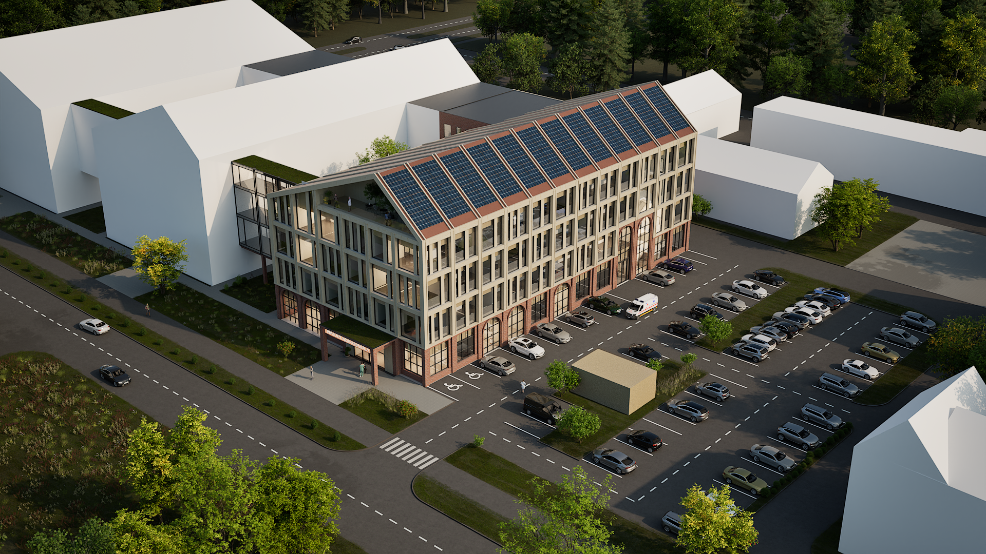 Katusel on päikesepaneelid, lisaks katusekorrusel on tehnoruumid, kuhu projekteeritakse jahutussüsteemid. Aknad on puitraamidega kolmekordse klaaspaketiga päikesekaitseklaasid.